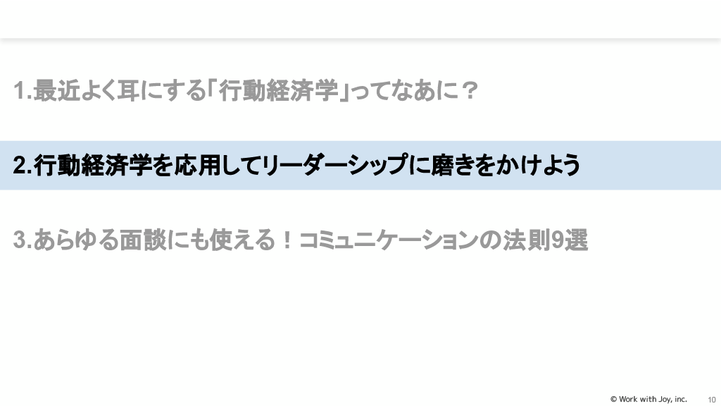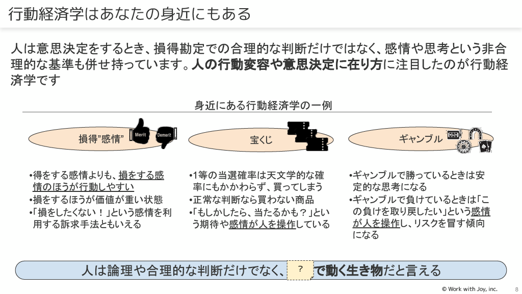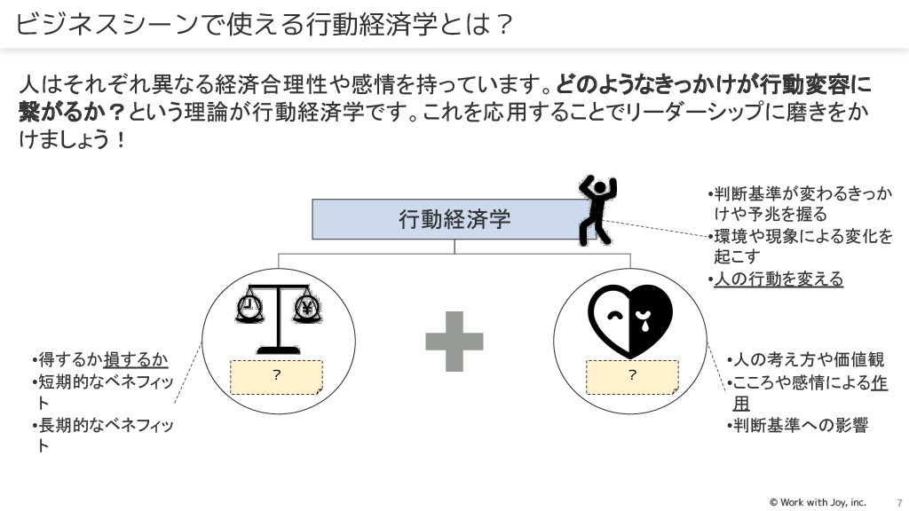 ビジネスシーンで使える行動経済学:行動経済学は、人の行動変容や意思決定のあり方に注目したもので、リーダーシップに応用できます。人は論理や合理的な判断だけでなく、感情でも動く生き物だと言えます。