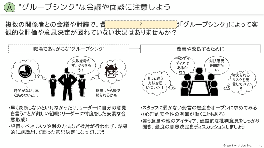 グループシンク:忖度や安易な合意形成による誤った意思決定に注意し、スタッフに罰のない発言の機会をオープンに求めましょう。