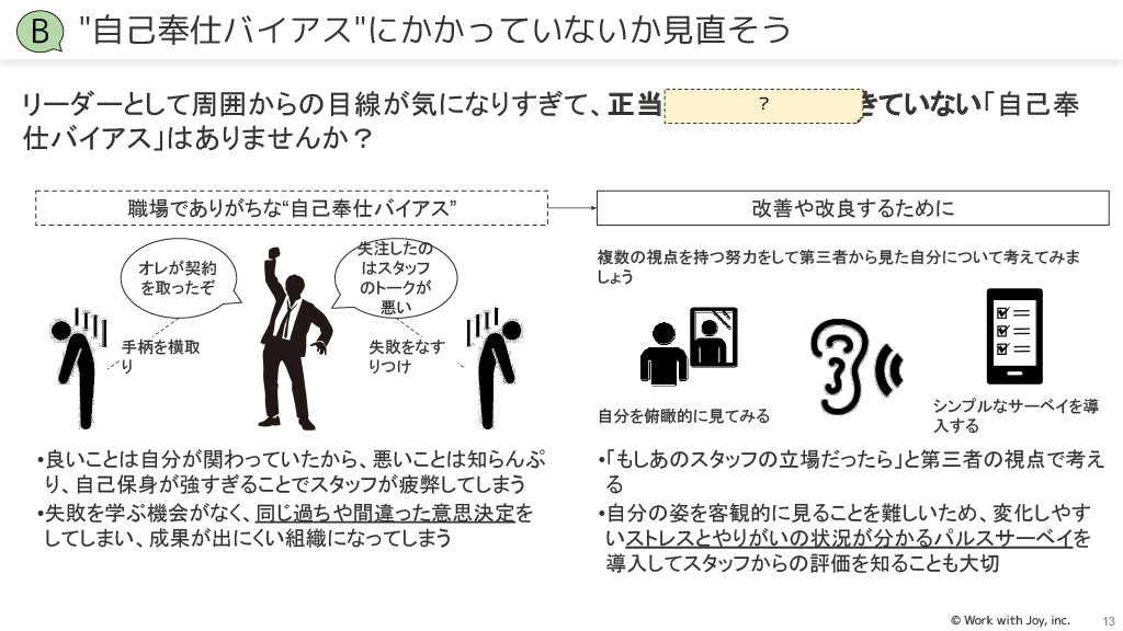 自己奉仕バイアス:良いことは自分の手柄、悪いことはスタッフのせいにすることを避け、第三者の視点で考える努力をしましょう。