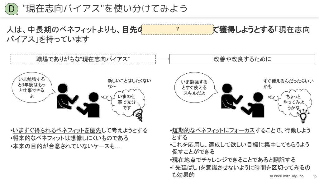 現在志向バイアス:長期的なベネフィットより目先の利益を優先する心理を利用し、短期的なベネフィットに焦点を当てて行動を促します。
