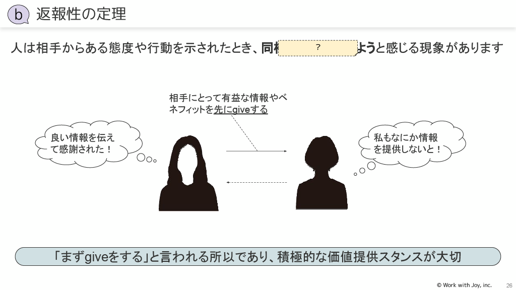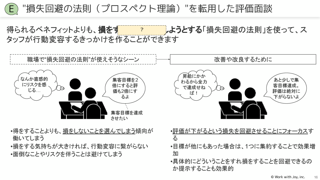 損失回避の法則:得られる利益よりも損を回避したいという心理を転用し、評価が下がるという損失を回避させることにフォーカスします。