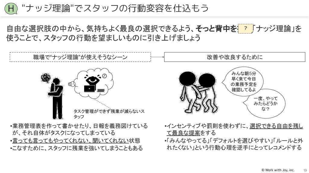 ナッジ理論:インセンティブや罰則を使わずに、自由な選択肢の中から最良の選択ができるよう、そっと背中を押すことで、望ましい行動に引き上げます。