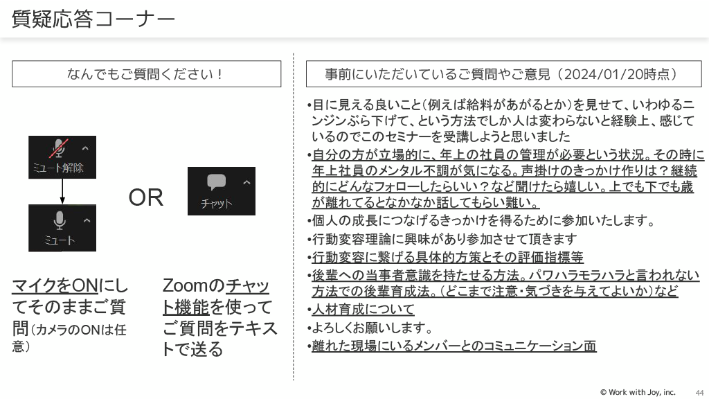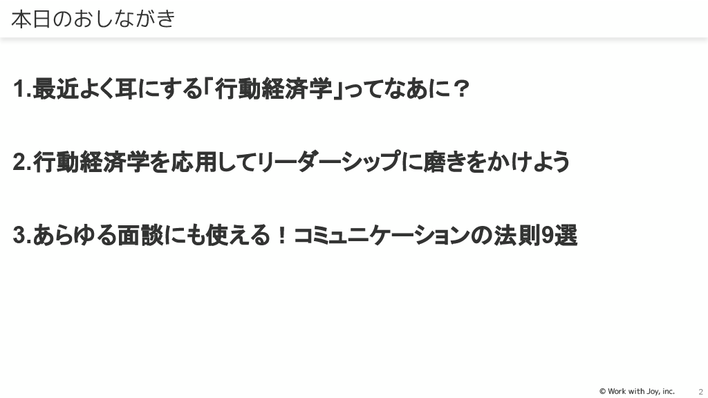 本資料は「行動経済学のテクニックを職場コミュニケーションに活かそう~行動変容を促すための職場コミュニケーション実践~」と題されたオンラインセミナー資料です。