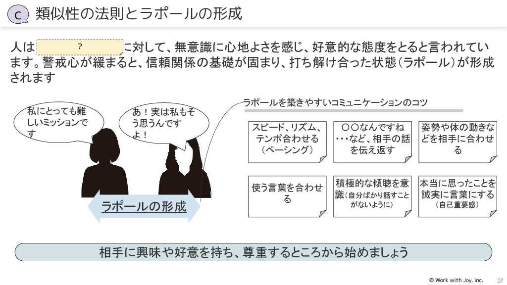 コミュニケーションの法則9選:メラビアンの法則、返報性の定理、類似性の法則とラポール形成、一貫性の法則、フット・イン・ザ・ドア・テクニック、リフレーミング、ピグマリオン効果、イエス・バット法、サトルクエスチョンが紹介されています。