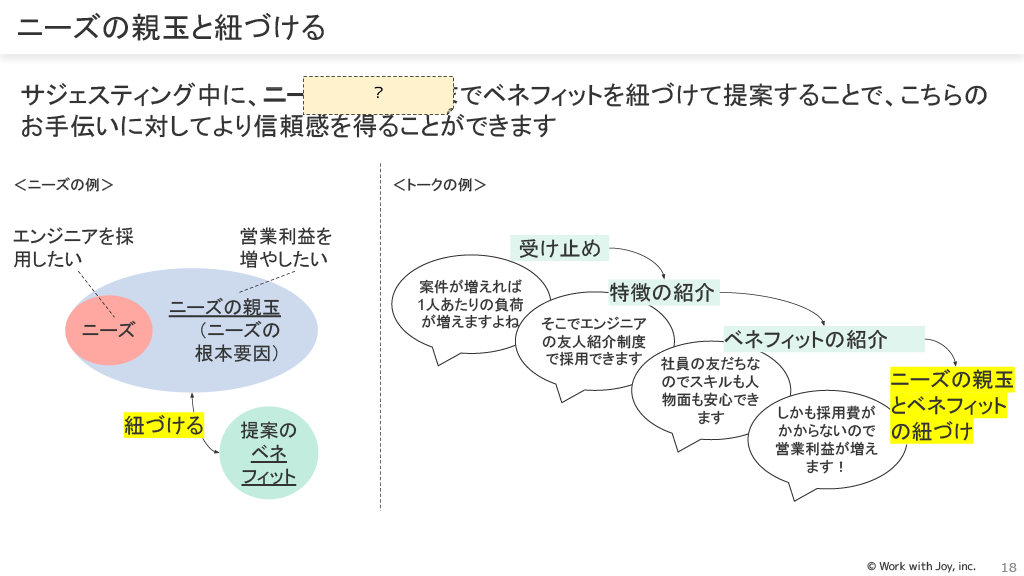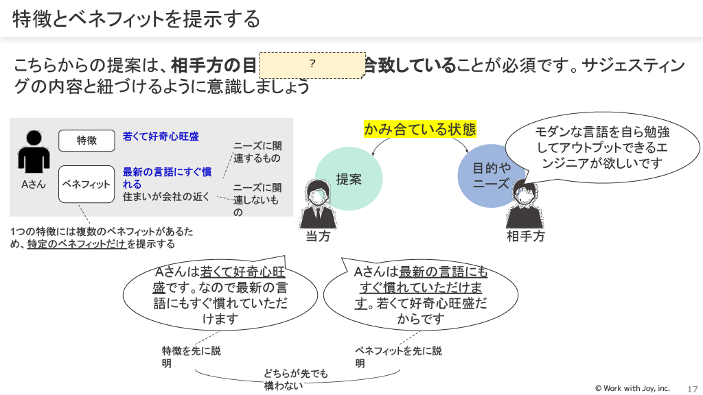 サジェスティングの流れ:目的やニーズを受け止める→特徴とベネフィットを提示する→ニーズの親玉と紐づける→同意のチェック。