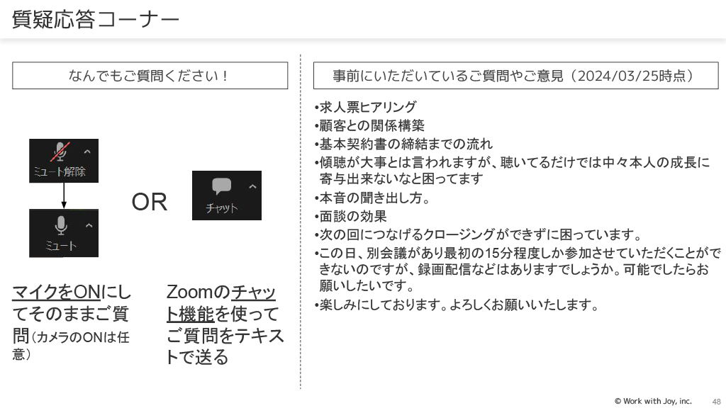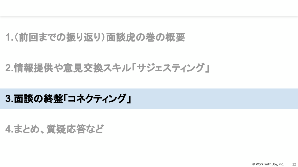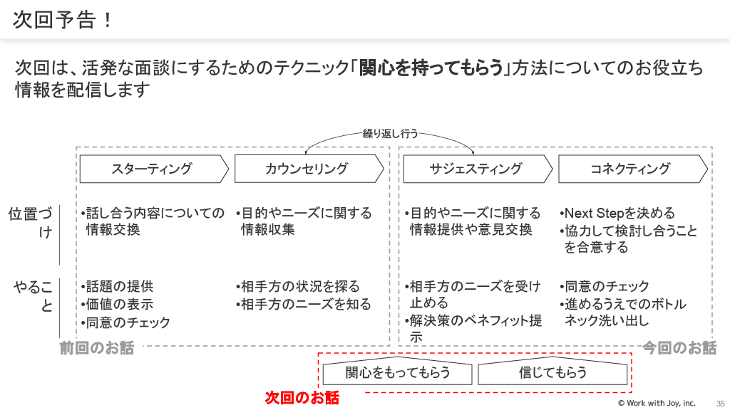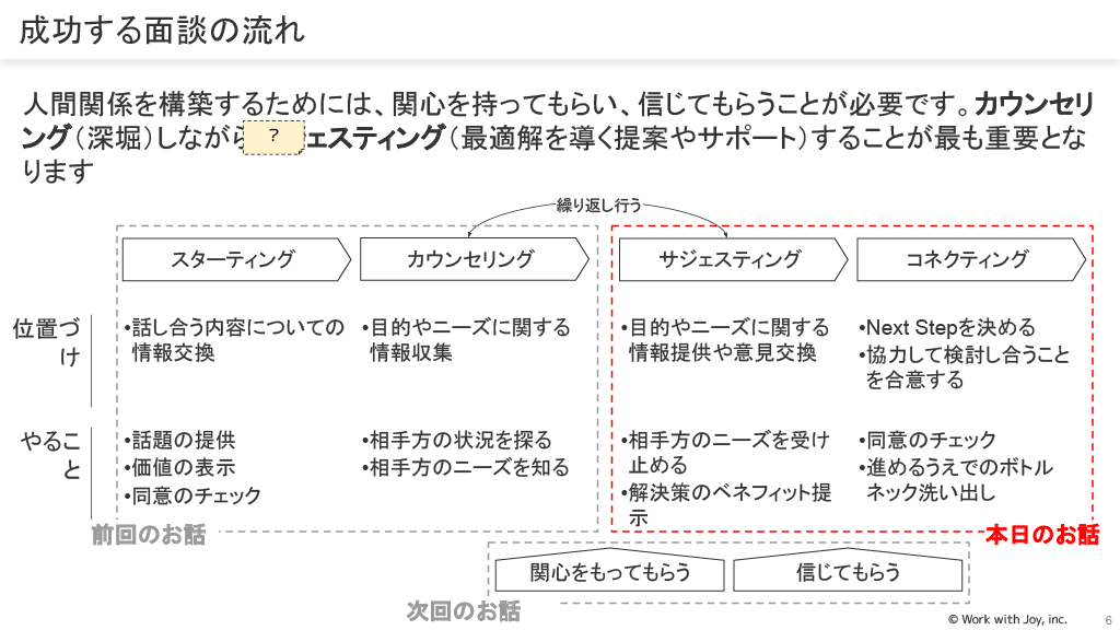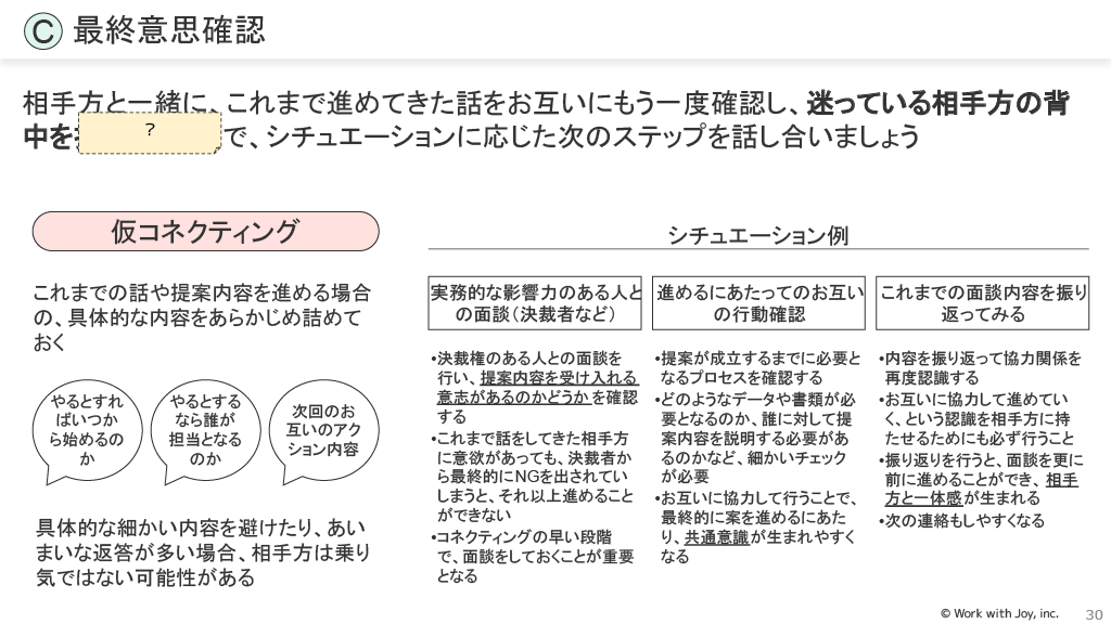 コネクティングとは:これまでの面談で得た目的やニーズに対し、お互いのベネフィットとなる行動や決定に至るために、役割分担や進め方を明確に合意するためのスキルです。