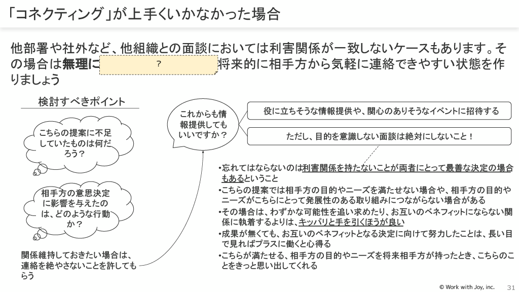 コネクティングを上手く進めるコツ:相手方のメリットを振り返る→お互いのアクションを提案→同意を得る、という流れを意識し、必要に応じて「プロポージング」「ギブアンドテイク」「ハイボーラー」の3大テクニックを使います。