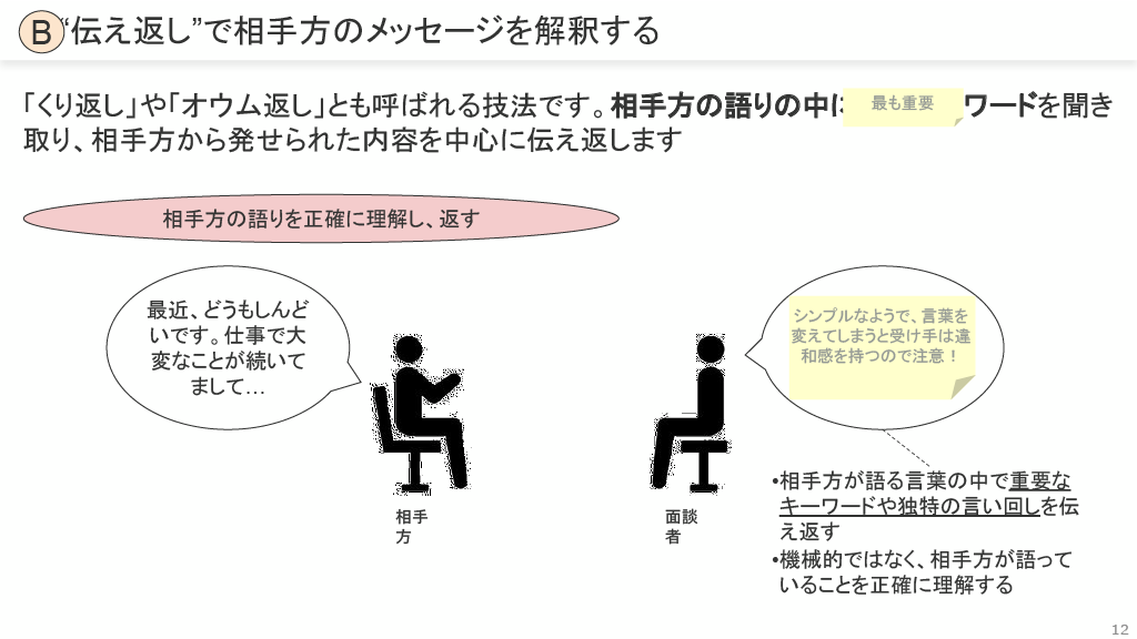 伝え返し(B): 相手の語りの中から最も重要なキーワードを聞き取り、内容を中心に正確に伝え返します。