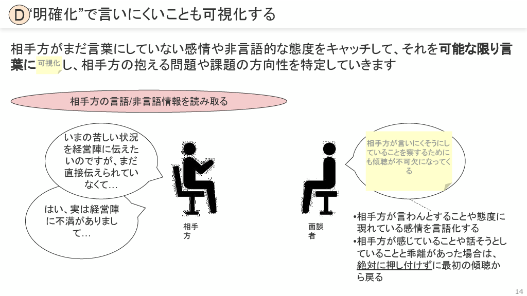 明確化(D): 相手がまだ言葉にしていない感情や態度を言語化し、問題の方向性を特定します。