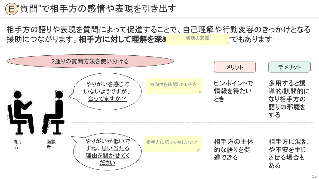 質問(E): 相手の語りや表現を促進し、自己理解や行動変容のきっかけとなる援助につなげます。