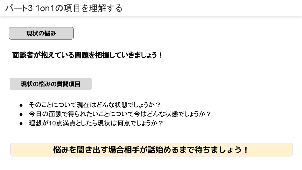 1on1は「ラポール構築」「ゴールの設定」「現状の悩み|問題点」「選択肢」「意思決定」の構造で理解し、目標をベースとした面談を目指します。