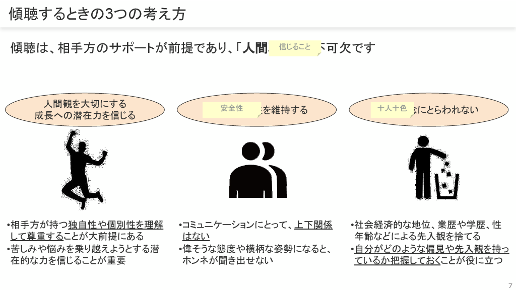 傾聴するときの3つの考え方は、「人間観を大切にする」「成長への潜在力を信じる」「安全性を維持する」ことです。