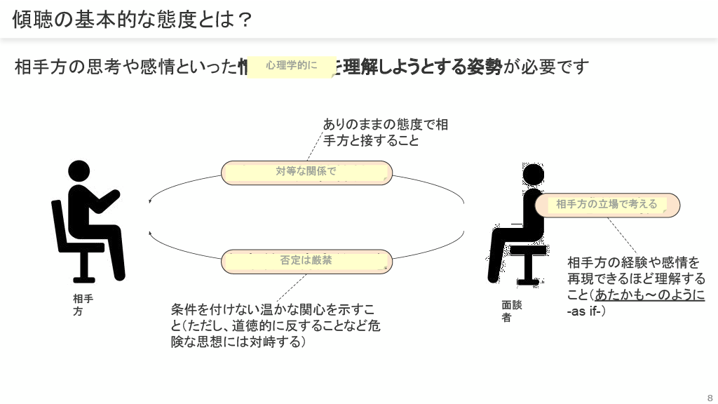 傾聴とは、相手方の内的照合枠(価値観や考え方)を理解し、その人が大切にしているものを感じ取ることから始まります。
