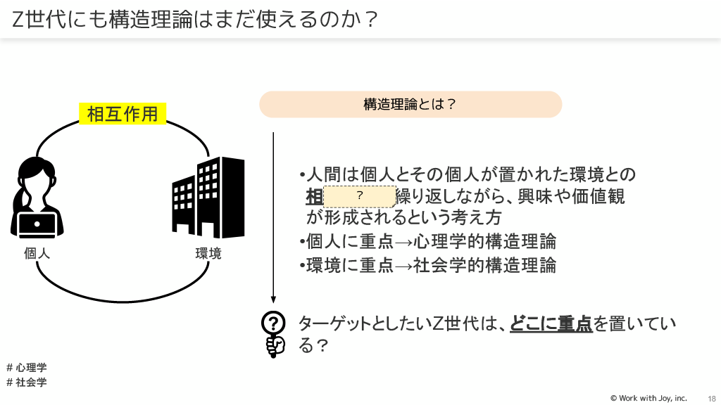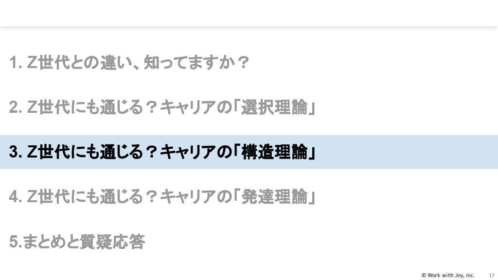 キャリアの「構造理論」(心理学的構造理論、社会学的構造理論)では、Z世代がどこに重点を置いているかを知ることが必要です。