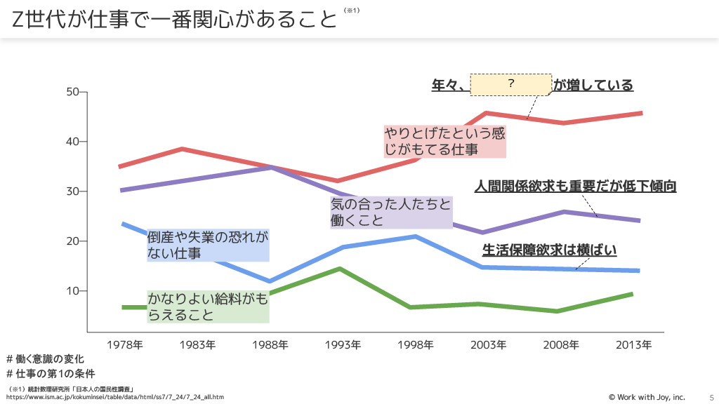 仕事で一番関心があることは「やりとげたという感じがもてる仕事」で、年々関心が増しています。