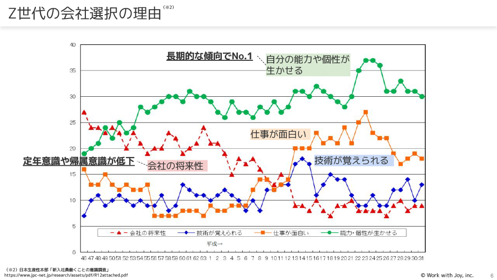 会社選択の理由は、「自分の能力や個性が生かせる」が長期的な傾向でNo.1です。