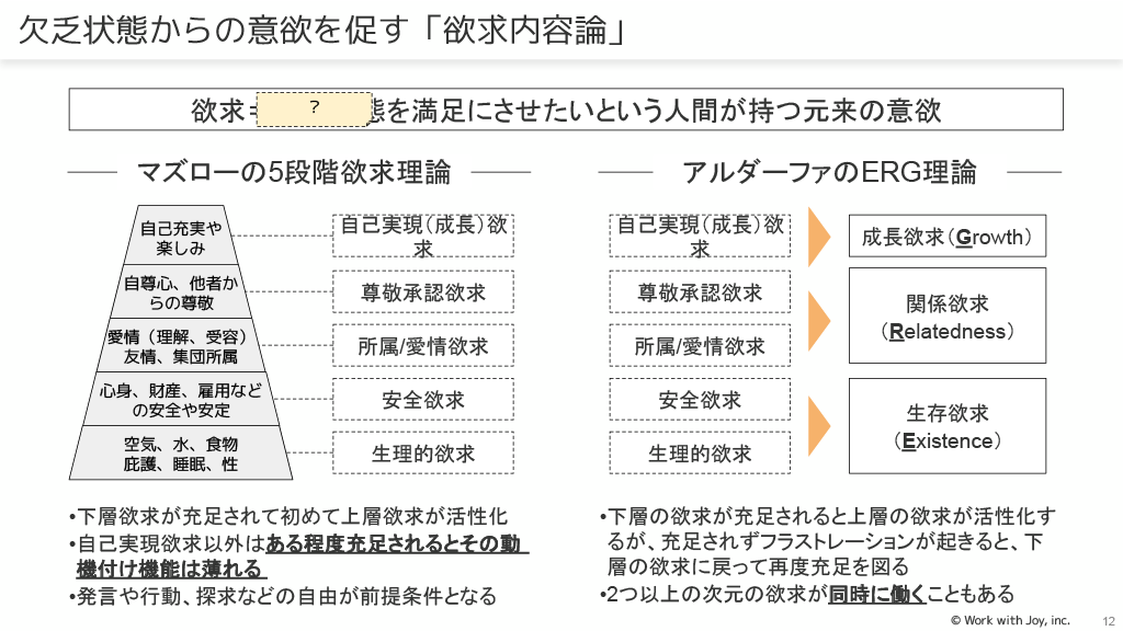 欲求内容論:マズローの5段階欲求理論とアルダーファのERG理論。