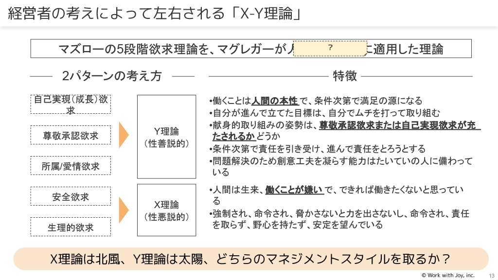 X-Y理論:経営者の考え(性善説的/性悪説的)でマネジメントスタイルが左右される。
