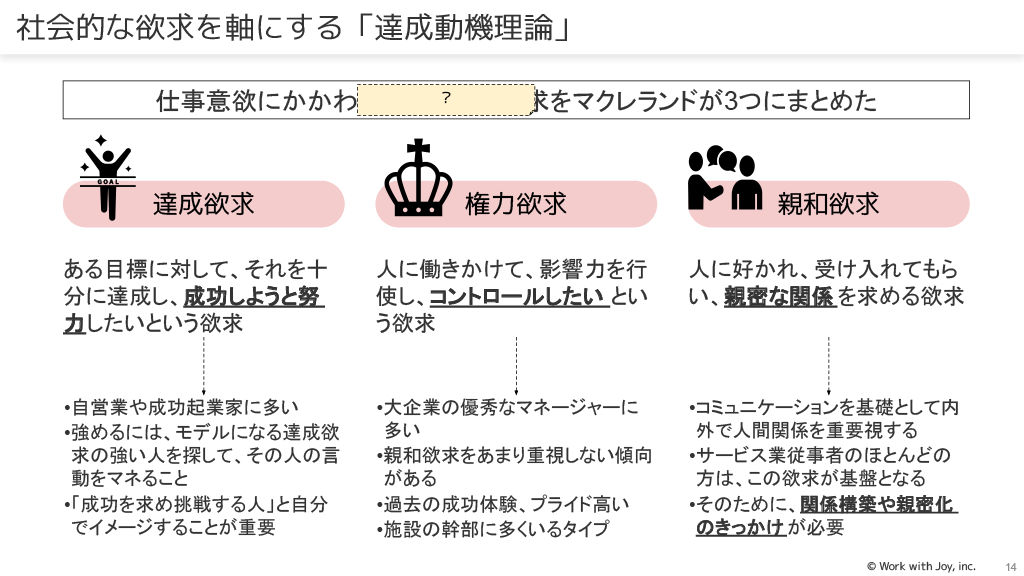 達成動機理論:達成欲求、権力欲求、親和欲求の3つ。