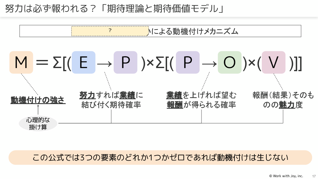 期待理論と期待価値モデル:動機づけの強さを示す公式 (M = Σ[(E→P) × Σ[(P→O)×(V)]])。