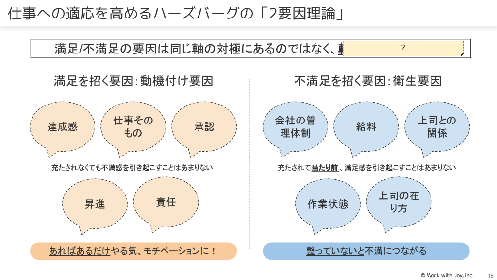 2要因理論(ハーズバーグ):満足を招く動機付け要因と不満足を招く衛生要因。