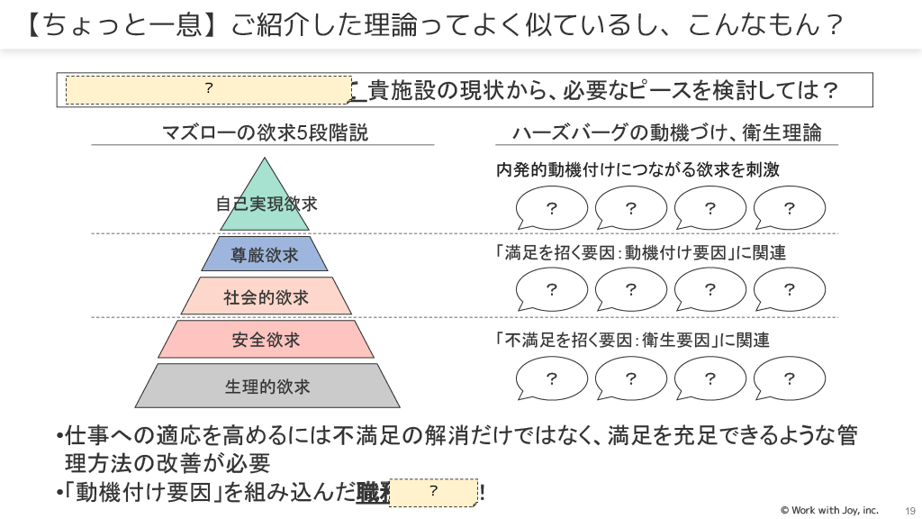 職務特性論(ハックマン):多様性、完結性、有意義性、自律性、フィードバック。