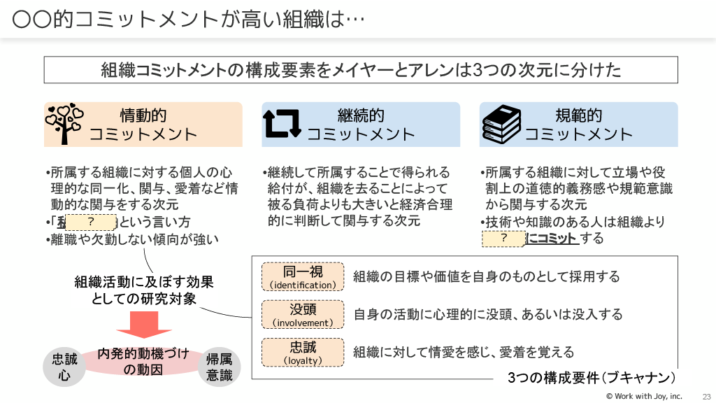 組織コミットメントの3次元(情動的、継続的、規範的)。
