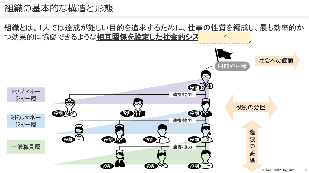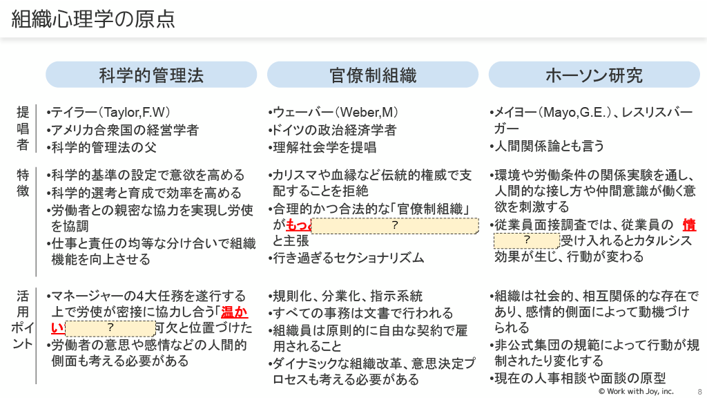 組織心理学の原点として、科学的管理法(テイラー)、官僚制組織(ウェーバー)、ホーソン研究(メイヨー)を紹介。