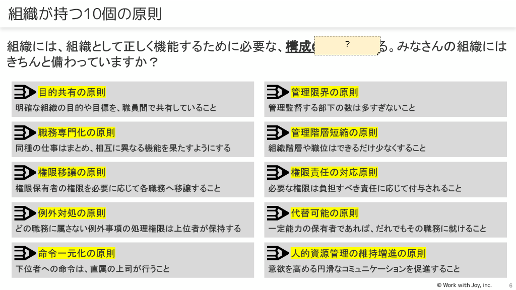 組織が持つ10個の原則(目的共有の原則、職務専門化の原則、権限移譲の原則など)。