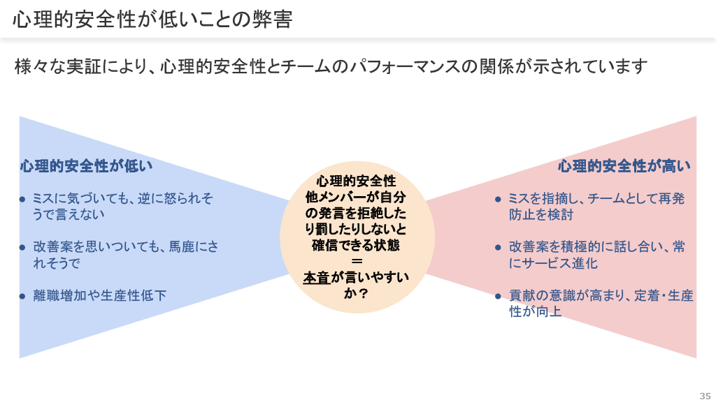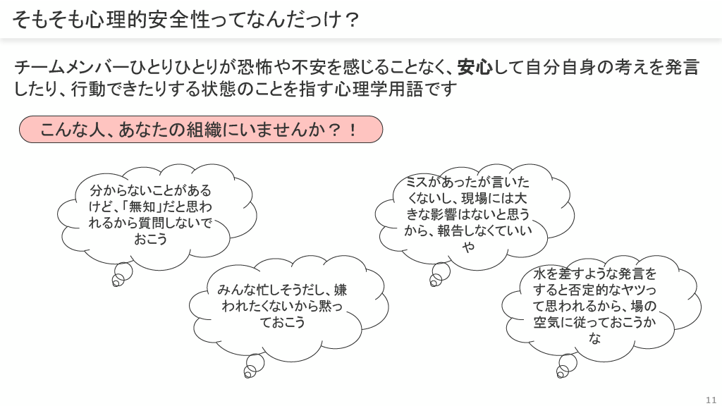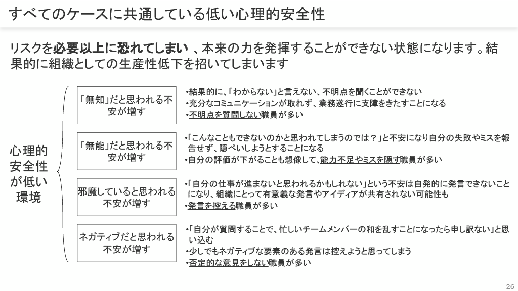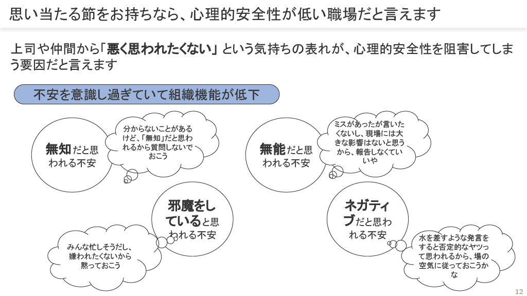心理的安全性が低い職場の不安:上司や仲間から「悪く思われたくない」という気持ちから、「無知」「無能」「邪魔をしている」「ネガティブ」だと思われる不安が生じ、組織機能が低下します。