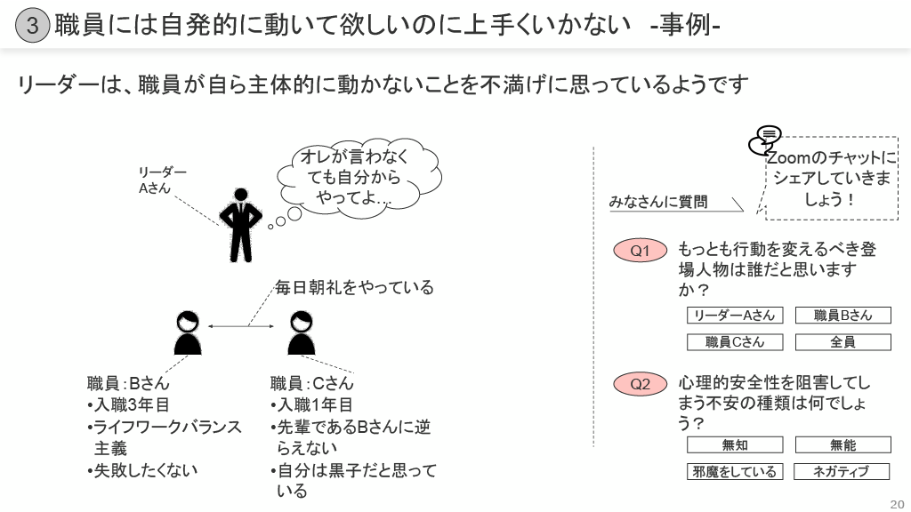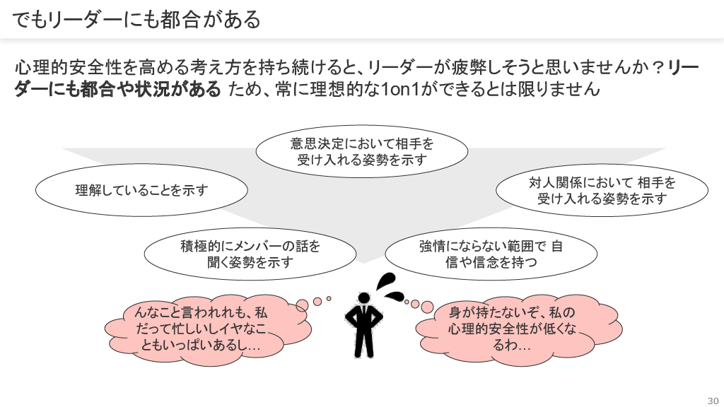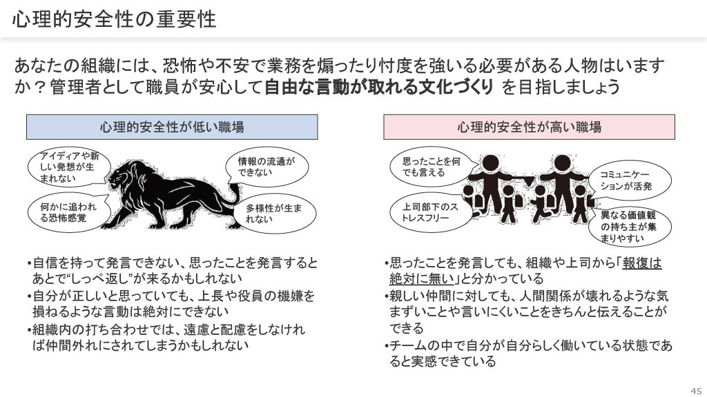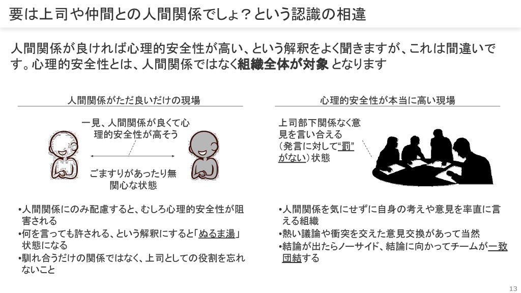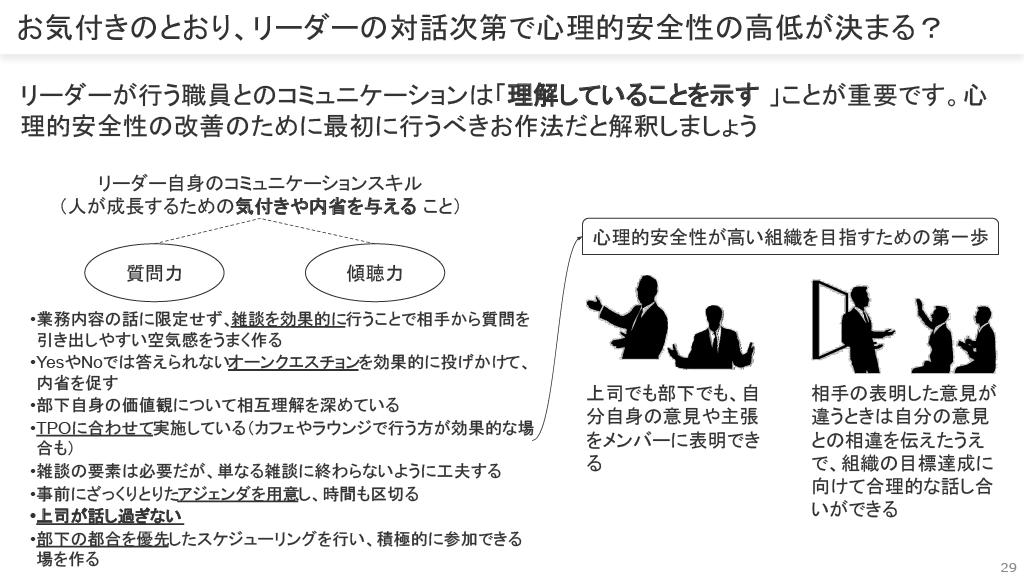 心理的安全性の引き上げ方:人間関係が良いことと心理的安全性が高いことは異なり、率直に意見を言い合える組織を目指す必要があります。リーダーが、頻繁なコミュニケーションや正しい1on1を通して、職員を理解している姿勢を示すことが重要です。