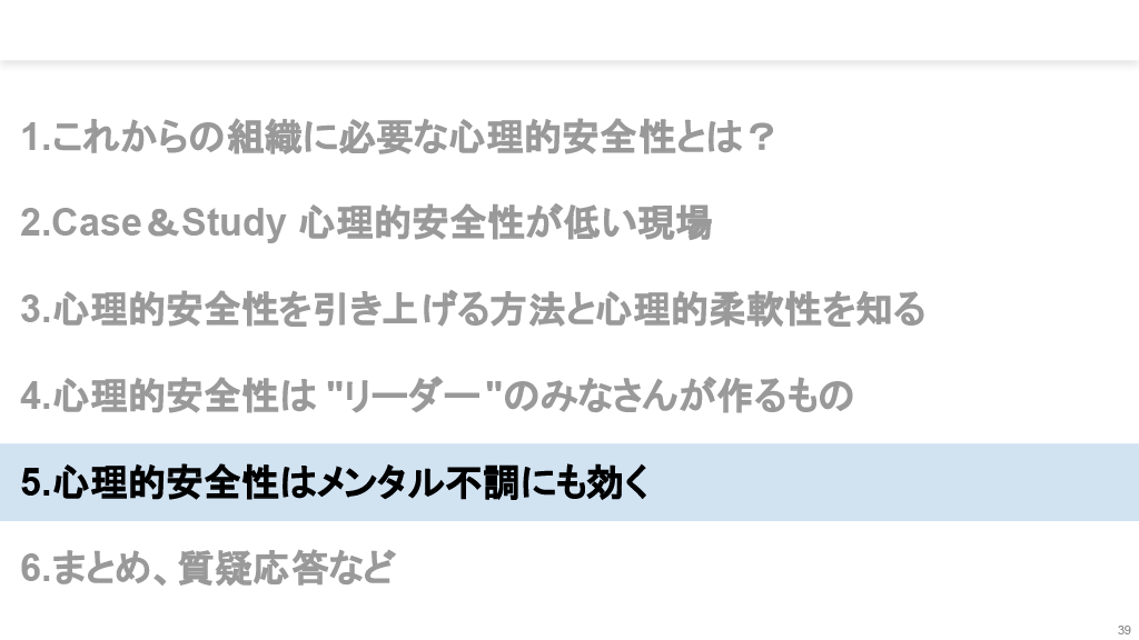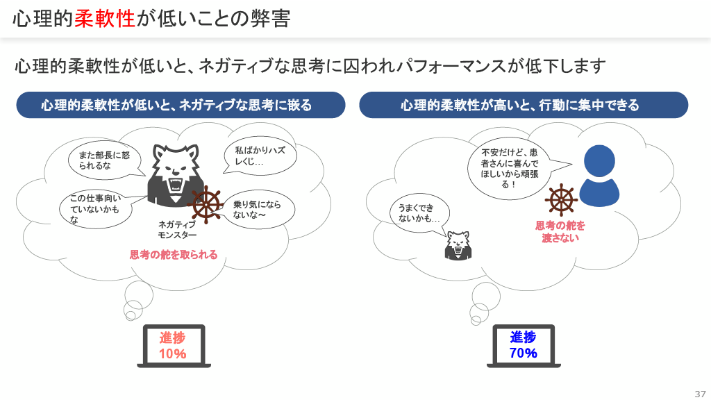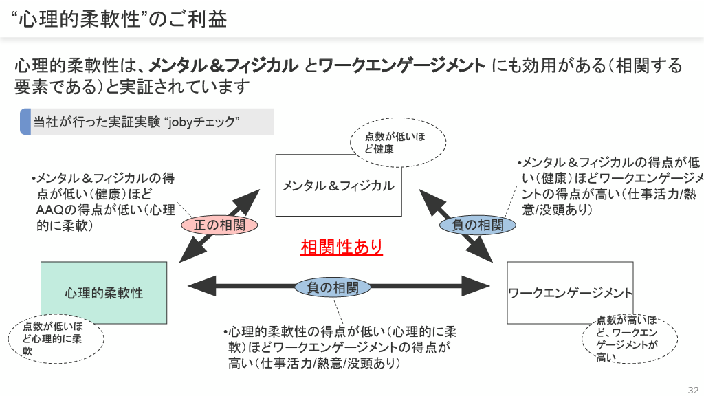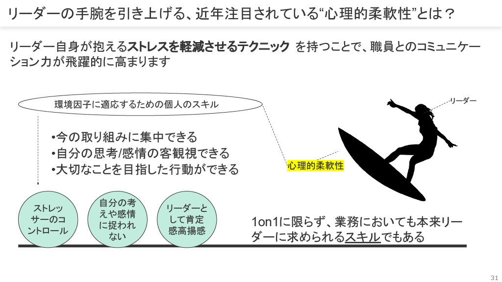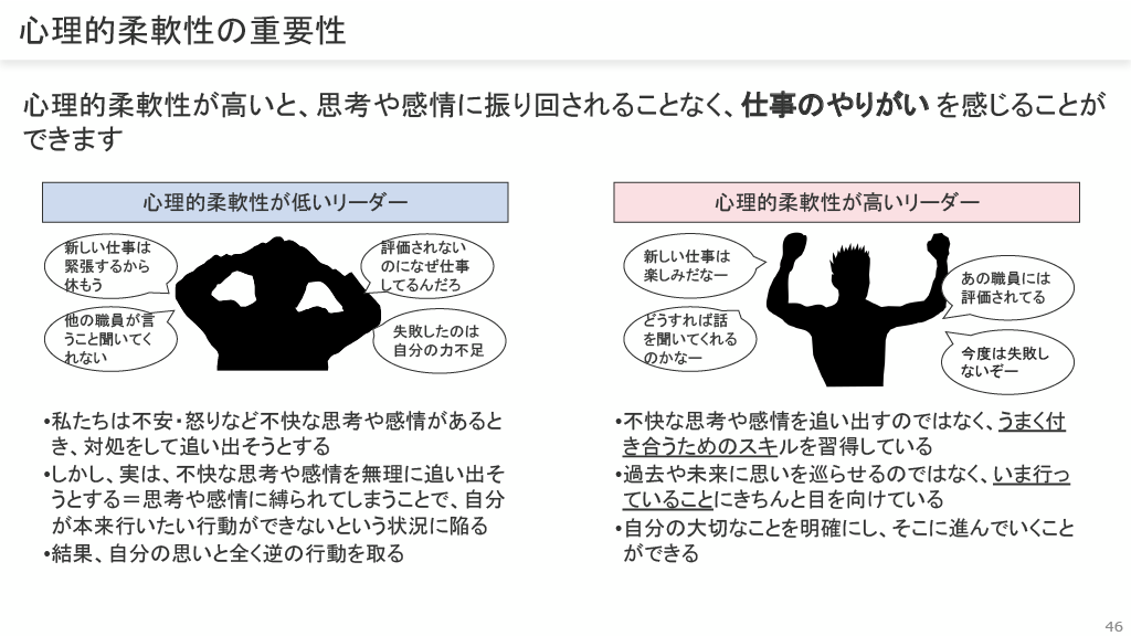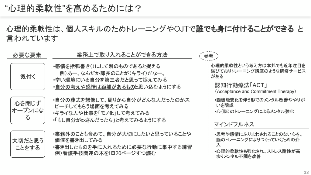 心理的安全性を高める考え方を持ち続けるリーダーの疲弊を防ぎ、職員とのコミュニケーション力を高めるために、環境因子に適応するための個人のスキルとして「心理的柔軟性」が注目されています。これは、メンタル・フィジカルの健康やワークエンゲージメントに効用があるとされています。
