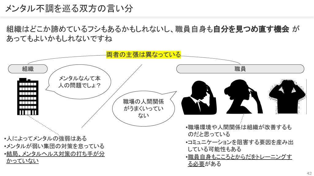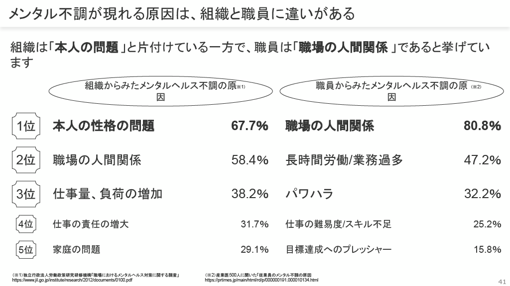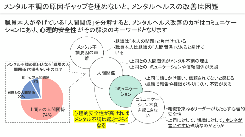 メンタル不調との関係:メンタル不調の原因について、組織は「本人の性格の問題」を1位とする一方で、職員は「職場の人間関係」を1位としており、特に「上司との人間関係」がメンタル不調の最も多い理由となっています。心理的安全性が高ければ、メンタル不調は起きづらくなると考えられます。